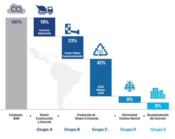 El ICH junto a la participación de la industria del cemento, desarrollaron una hoja de ruta basada principalmente en las estrategias del GCCA y FICEM adaptadas a las necesidades de a región enfocándose en 2 ejes de emisiones y 8 ejes de reducción, englobados dentro de 4 grupos: