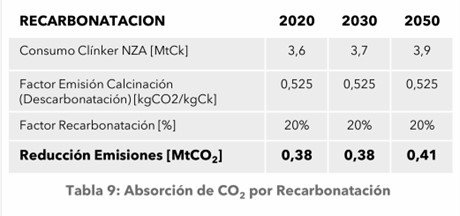 • Recarbonatación: Definido como la reacción química por la cual el CO₂ atmosférico es absorbido por el hormigón durante su ciclo de vida, formando carbonato cálcico lo que fortalece la estructura del hormigón al aumentar la densidad de su matriz porosa y contribuye a la remoción parcial de emisiones de CO₂ asociadas al cemento.