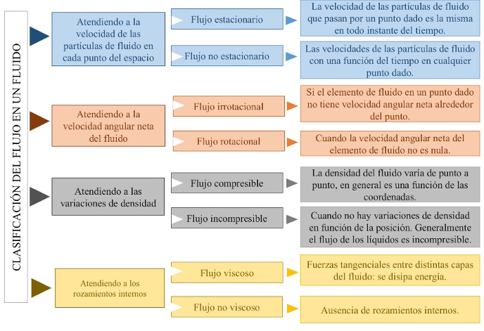 La clasificación de flujo puede realizarse de varias maneras, atendiendo al cambio de velocidad y dirección que sufren las partículas debido al espacio recorrido; al cambio de velocidad, dirección y posición de las partículas respecto al tiempo y, a las variaciones de las propiedades de las partículas respecto al tiempo. En la figura 1 se muestra de forma general una posible clasificación de los tipos de flujo.