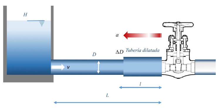 En la figura 3, “a” es la velocidad de propagación de la onda del golpe de ariete, v la velocidad del fluido, “D” el diámetro de la tubería y “∆D” es lo que se dilata debido al incremento de presión.