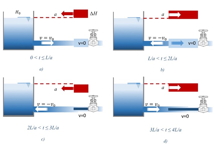 En la figura 4, se muestra una representación de la propagación y reflexión de la onda del fenómeno en una tubería de longitud “L” provocada por el cierre instantáneo de una válvula, ubicada en el extremo de aguas abajo que comienza desde un depósito con altura “H”.