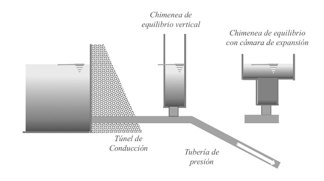 Una chimenea de equilibrio, también conocida como pozo piezométrico, es un depósito abierto a la atmósfera en su extremo superior conectado perpendicularmente a la tubería de conducción. Las chimeneas de equilibrio están destinadas para obras en donde los caudales y las velocidades de flujo son bastante significativas, como centrales hidroeléctricas. Existen dos tipos de chimeneas: de equilibrio vertical y con cámara de expansión (véase figura 8).