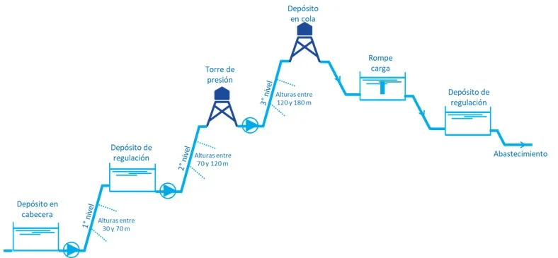 Redes escalonadas con varios pisos de presión: En ciertas situaciones, donde se requiere llegar a sectores de gran altura, se dispone en dividir el área en varios niveles como se aprecia en la Figura 8, evitando las sobrepresiones que pueden afectar al coste de infraestructura de la red. Se debe tener cuidado en aducciones por gravedad, asegurando depósitos de regulación intermedios y válvulas reductoras de presión.