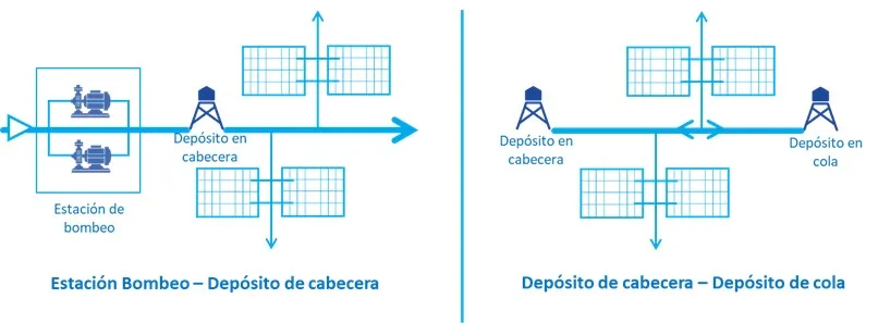 Redes de solo un piso de presión: Solo se proporciona agua en un nivel, se puede tener una estación de bombeo suministrando hacia un depósito en cabecera para la red de distribución, como se aprecia en el lado izquierdo de la Figura 7. Cuando la red posee aumentos de demanda, la cota geométrica del depósito le es imposible satisfacer los caudales, ahí es cuando se opta por instalar un depósito en cola como se muestra a la derecha de la Figura 7.