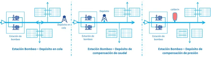 Redes de abastecimiento directamente mediante grupo de bombeo: En algunas ciertas redes, la orografía solo permite el uso de grupo de bombeo directo. Esto se explica cuando la cota topográfica del terreno no permite garantizar las presiones mínimas necesarias. La configuración puede variar según la necesidad de caudal o presión, así como se aprecia en la Ilustración Figura 9, está: Estación de bombeo – depósito en cola; Estación de bombeo – depósito de compensación; Estación de bombeo – calderín (depósito hidroneumático).